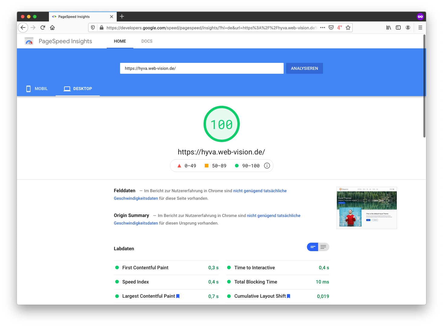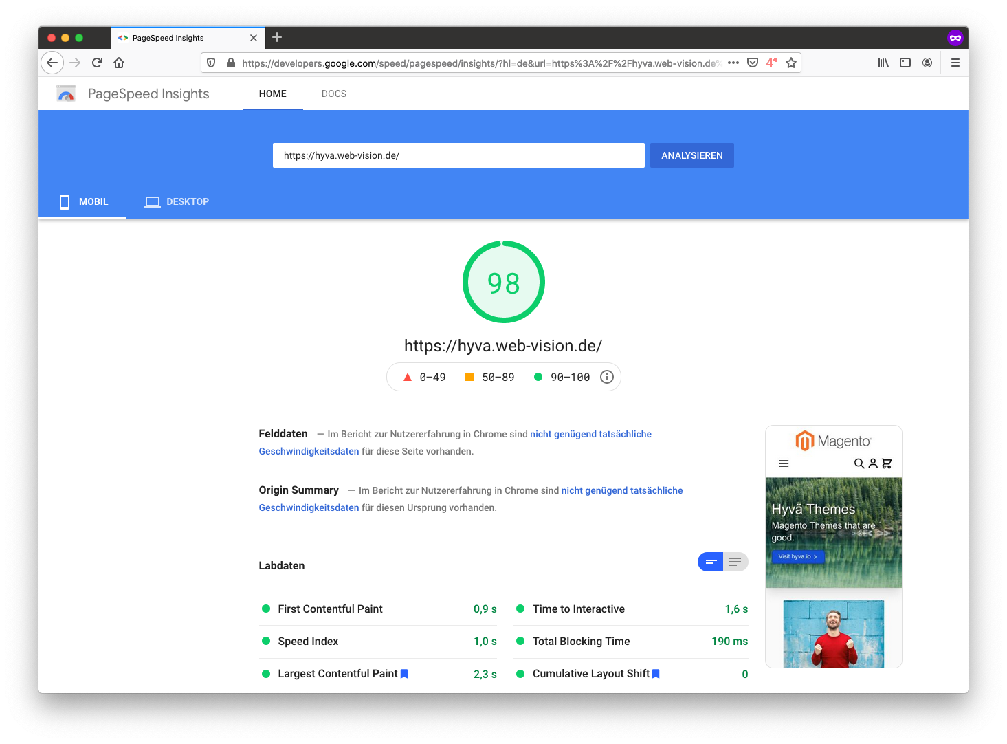 Dies zahlt sich umgehend, bereits bei Erst-Installation, ohne große Anpassungen deutlich aus. Ein Demo-Hyva-Shop erreicht damit ohne Aufwand sofort einen Mobile-Score von über 80 Punkten im Google Pagespeed Check. Auf Desktop-Rechnern liegt der Score bereits bei 98 von 100 Punkten.