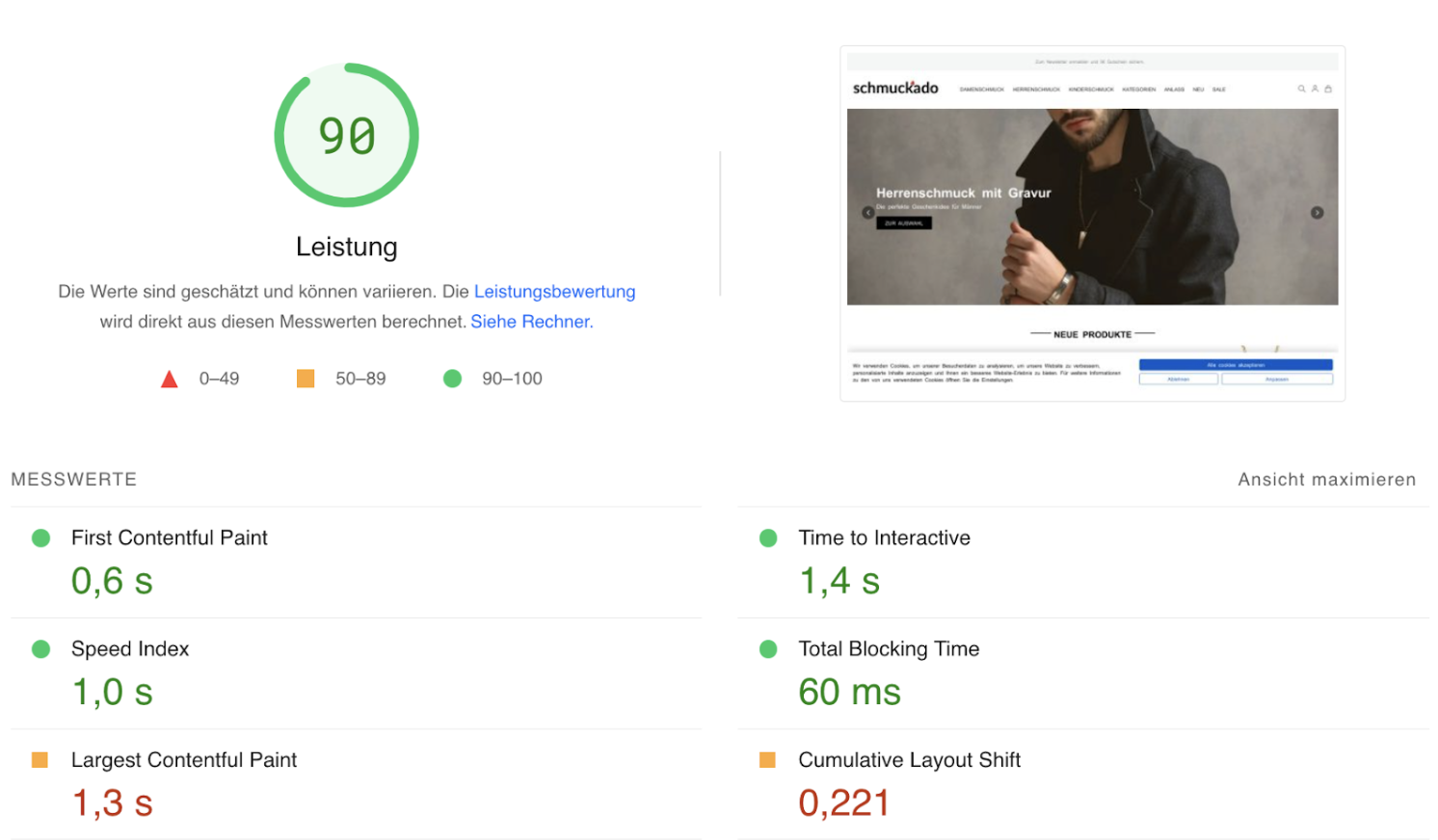 Auch bei diesem Projekt lässt sich wieder einmal erkennen, welche positiven Auswirkungen die Verwendung unseres optimierten Hyvä-Themes auf den Pagespeed hat. Ohne weitere Optimierungsmaßnahmen werden in der Desktop-Ansicht bereits 90 von 100 möglichen Punkten erreicht!