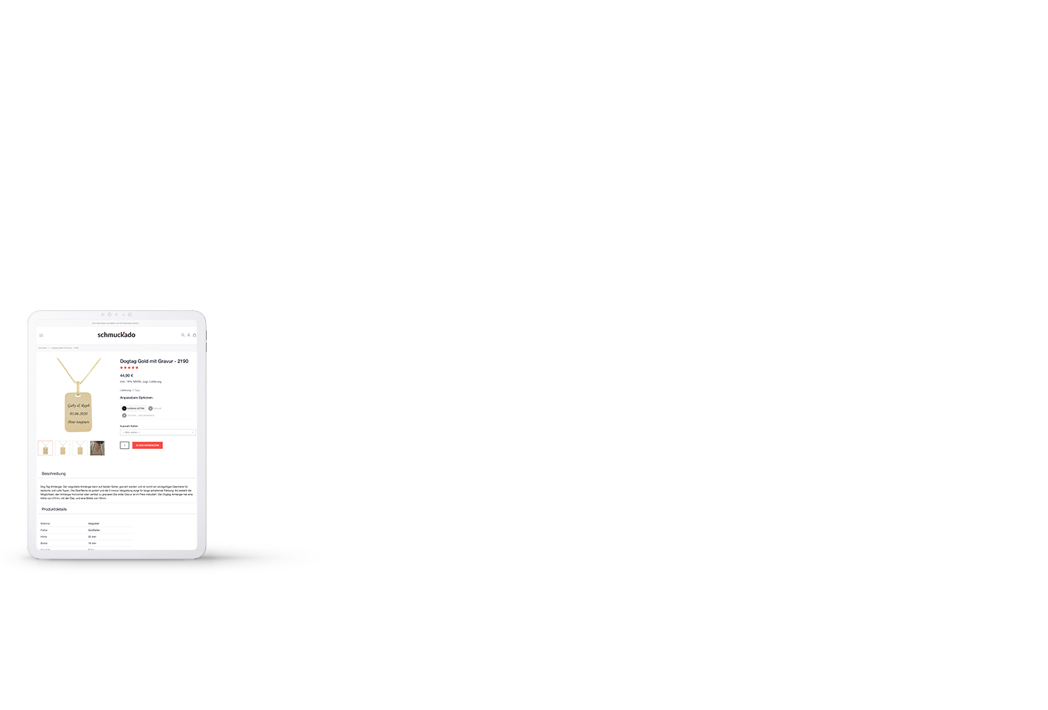 Schmuckado-Kunden können die gewünschten Produkte einfach direkt im Onlineshop personalisieren. Die Kunden können vor Auswahl der Gravur bereits die Kettenbeschaffenheit (Panzer-, Leder-, Kugelkette) sowie -Farbe (gold, silber, rosé, etc.) und die Länge der Kette wählen und das Schmuckstück in den weiteren Schritten ganz nach Herzenslust individualisieren. Neben der Auswahl der Gravur-Art (Laser oder Diamant) können selbstverständlich Schriftart und -Größe der Gravur, Textausrichtung sowie Länge des Textes bequem über nutzerfreundliche Drop-Down-Elemente gewählt werden.